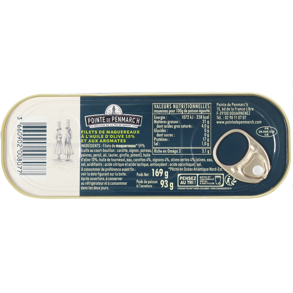 Les maquereaux sont pêchés au chalut, de novembre à janvier, période la plus propice pour le taux de matière grasse qui garantit la saveur et la tendreté du poisson. Ces filets de maquereaux sont triés et parés manuellement aux ciseaux puis ils sont mis en conserve un à un après la dépose des aromates en fond de boîte. Il existe de nombreuses façons de cuisiner ce poisson.
